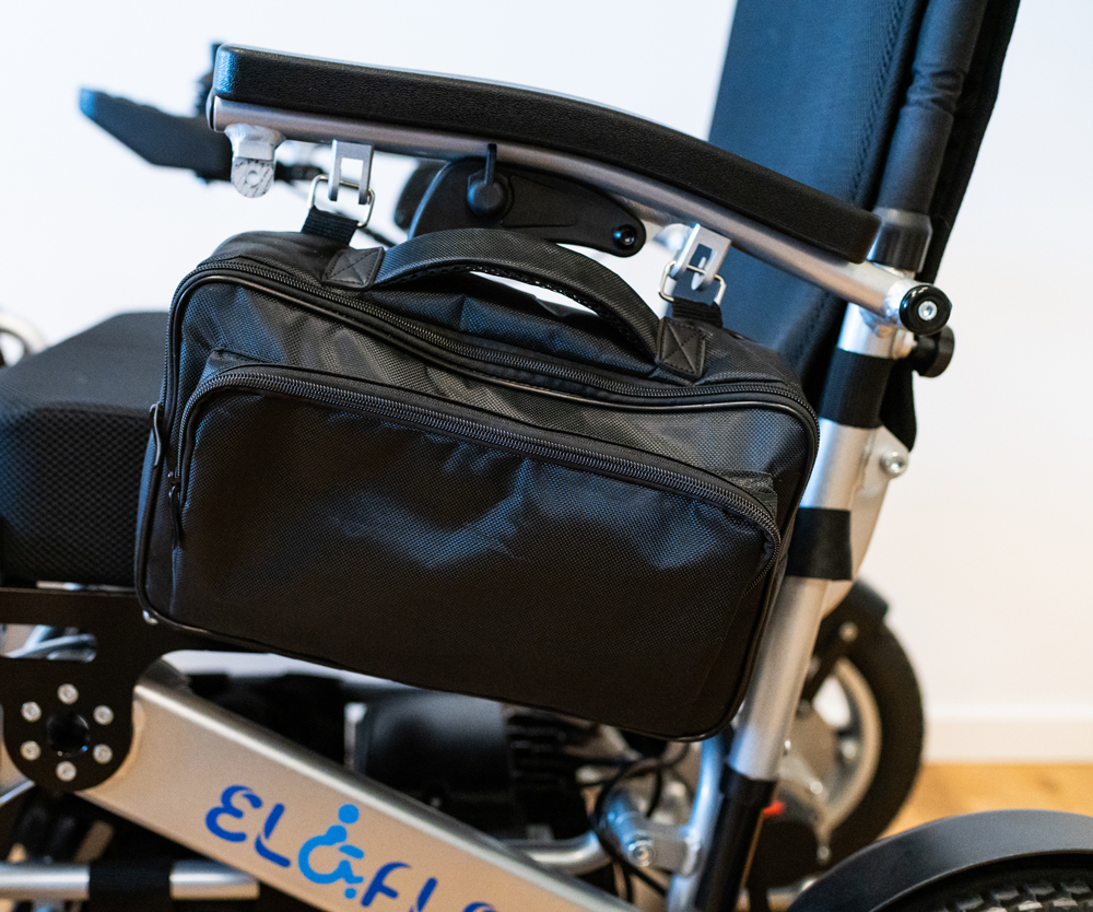 Bočna torba Eloflex vam omogućava praktično pohranjivanje predmeta kao što su novčanik, telefon i druge vrijednosti za brzi pristup. Torba se pričvršćuje pomoću kukica koje su pričvršćene ispod naslona za ruke. Da biste pristupili svojim stvarima, jednostavno otkačite torbu sa unutrašnje strane naslona za ruke kako biste joj mogli lako pristupiti bez straha od krađe.